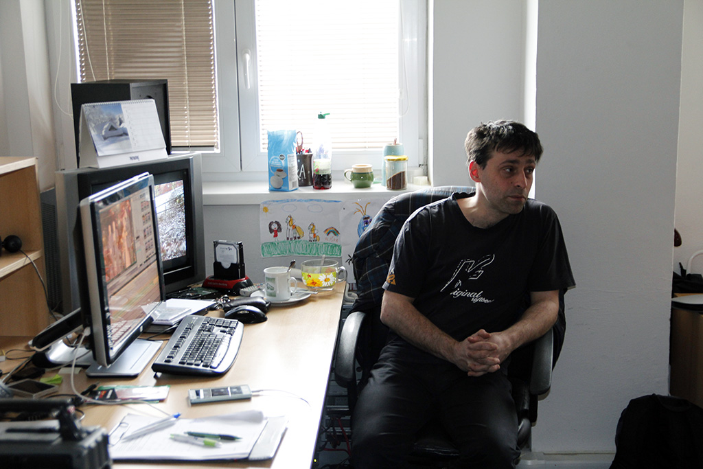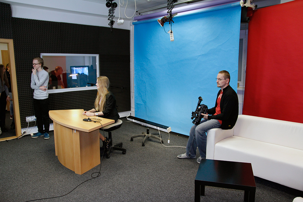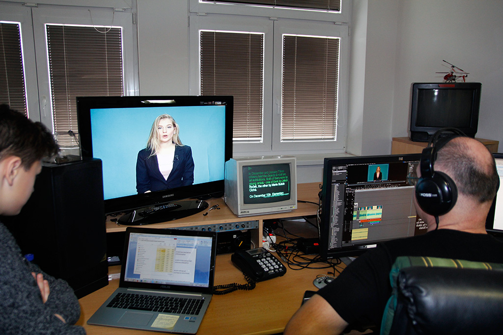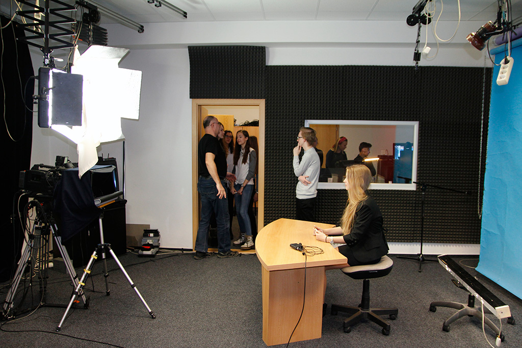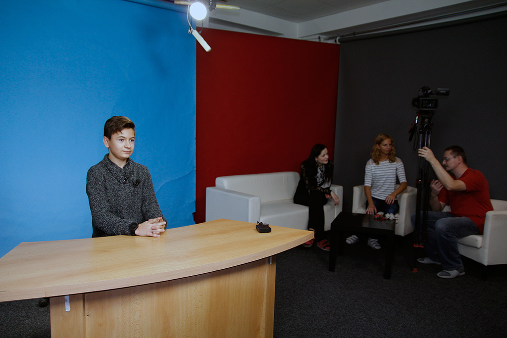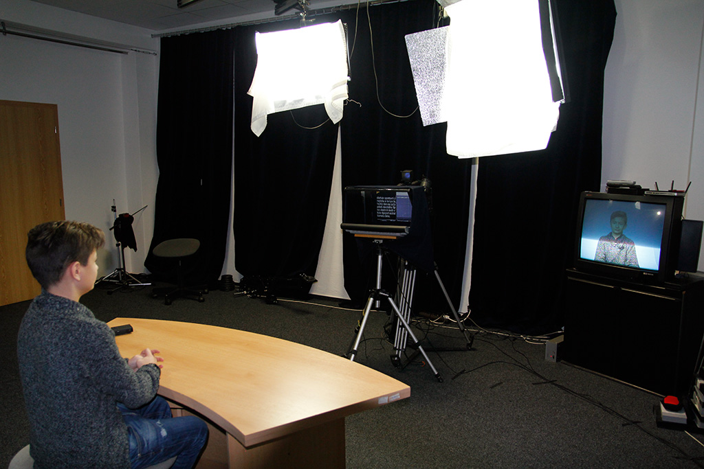 The three teachers observed and helped the students and also monitored what progress was being made. For better imagination we made a trip to Czech television in Ostrava and local TV in Třinec. In the local TV, they offered us to use their newsroom and two of our moderators could use their autocue (reading the news from the camcorder). They also helped us to extract both moderators and put them into the virtual newsroom by using the green screen (actually they are using blue one).